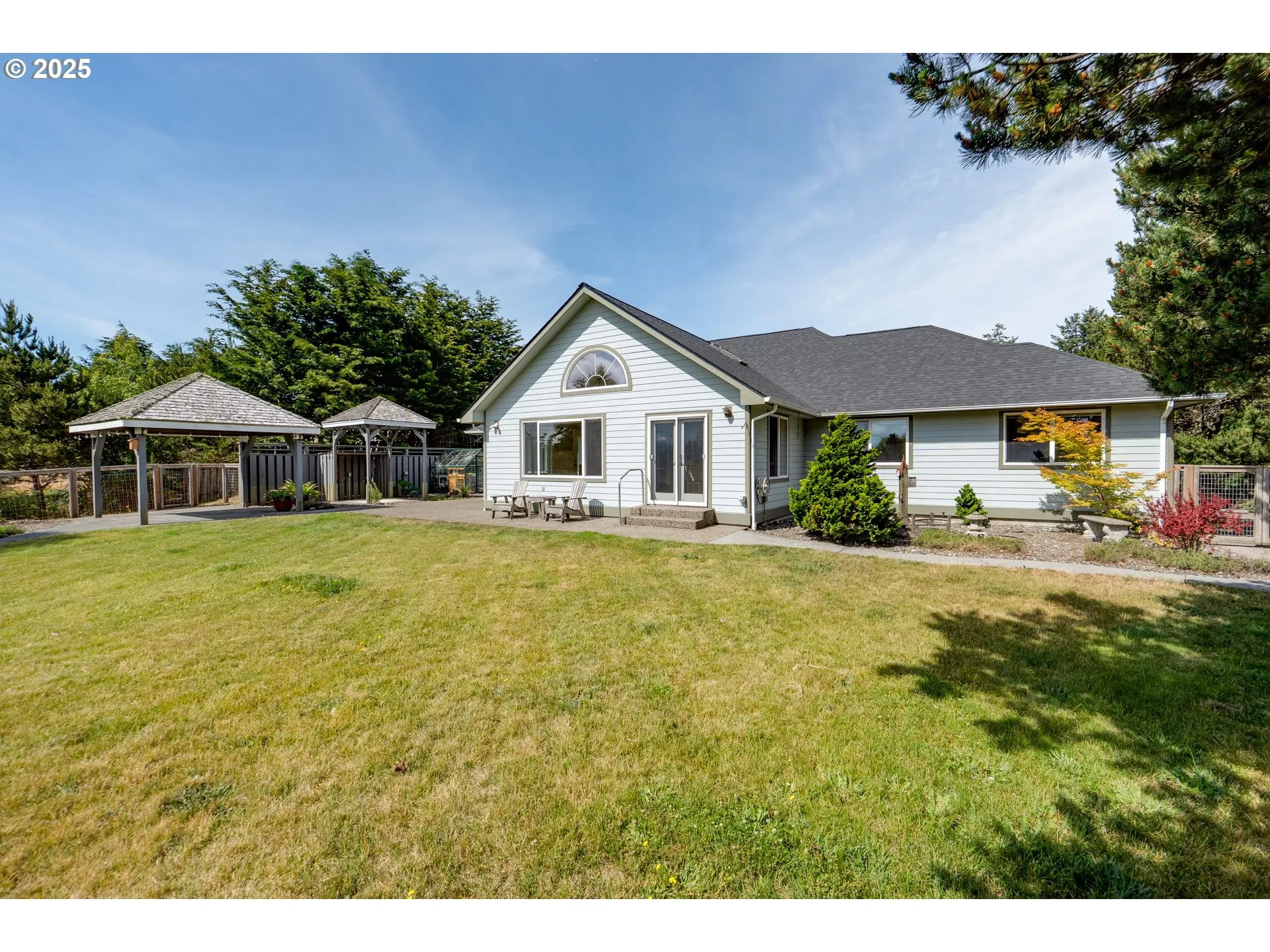 Surf Pines Single Level Sanctuary on 1 Acre! Enjoy a Storybook Setting, Outdoor Living, Lush Landscaping, Gardens, a Greenhouse, Pergolas, Privacy & Understated Luxury. There is Much to Love from the Horseshoe Drive with RV & Boat Parking, Newer Roof & Hardwood Floors Throughout to the Light Infused Great Room with Vaulted Ceilings, Wainscoting & a Stacked Stone Gas Fireplace. Entertaining is a Breeze in a Spacious Gourmet Kitchen Fitted with 2 Pantries, Newer Appliances, Granite Countertops & Island with Raised Bar. Retreat to a Dreamy Primary Ensuite with Patio Access & Modern Bath Featuring a Tiled Walk-In Shower, Double Vanities, New Freestanding Tub & an Extra Large Closet with Mirrored Doors. Watch the Video, Ask for the Features List & Book a Showing Straightaway! Do Not Miss the Detached Studio with Overhead Loft, 3 Powered Sheds or the Outdoor Shower. Ideally Situated Higher Above the Surf in One of the Top Gated Communities on the Oregon Coast. Frolic on the Beach & Take the High Road Home!