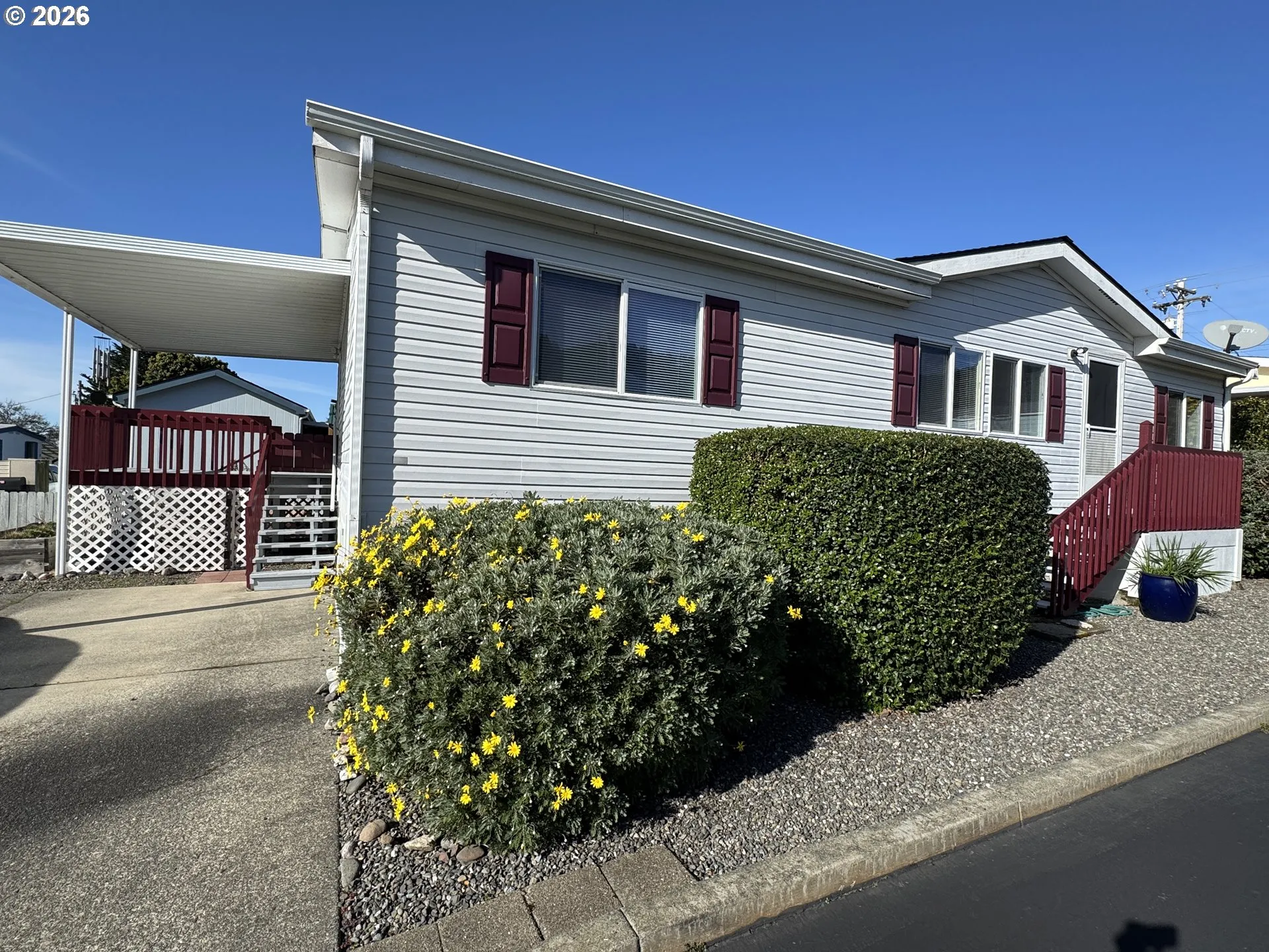 Located in the well-cared-for 55+ Lilly Court Park, this home places you walking distance from Sporthaven Beach, the harbor, fishing docks, and popular eateries—everything you need to enjoy the coastal lifestyle. Charming, 3Bd/2Bth double-wide has a open-concept layout with vaulted ceilings and abundant natural light. Spacious kitchen features stainless steel appliances, built-in dishwasher, large island with eating bar, newer bar stools, and extensive cabinetry. Laundry room with newer washer/dryer and adjacent full guest bath. Primary suite includes walk-in bathroom; two additional bedrooms are set on the opposite end of the home for privacy. Central A/C. Built with upgraded 2×6 exterior walls for added strength and efficiency; roof replaced approx. 5 years ago. Situated on a desirable corner lot with low-maintenance landscaping, Santa Rosa plum and lemon trees, blooming lilacs, covered porch, Trex deck, fenced yard, and fire pit. There is additional storage space to bring in a utility shed. Two parking spaces (one covered). Space rent $600/mo includes water and sewer. Approx. 0.5 mi to Sport Haven Beach and harbor dining.