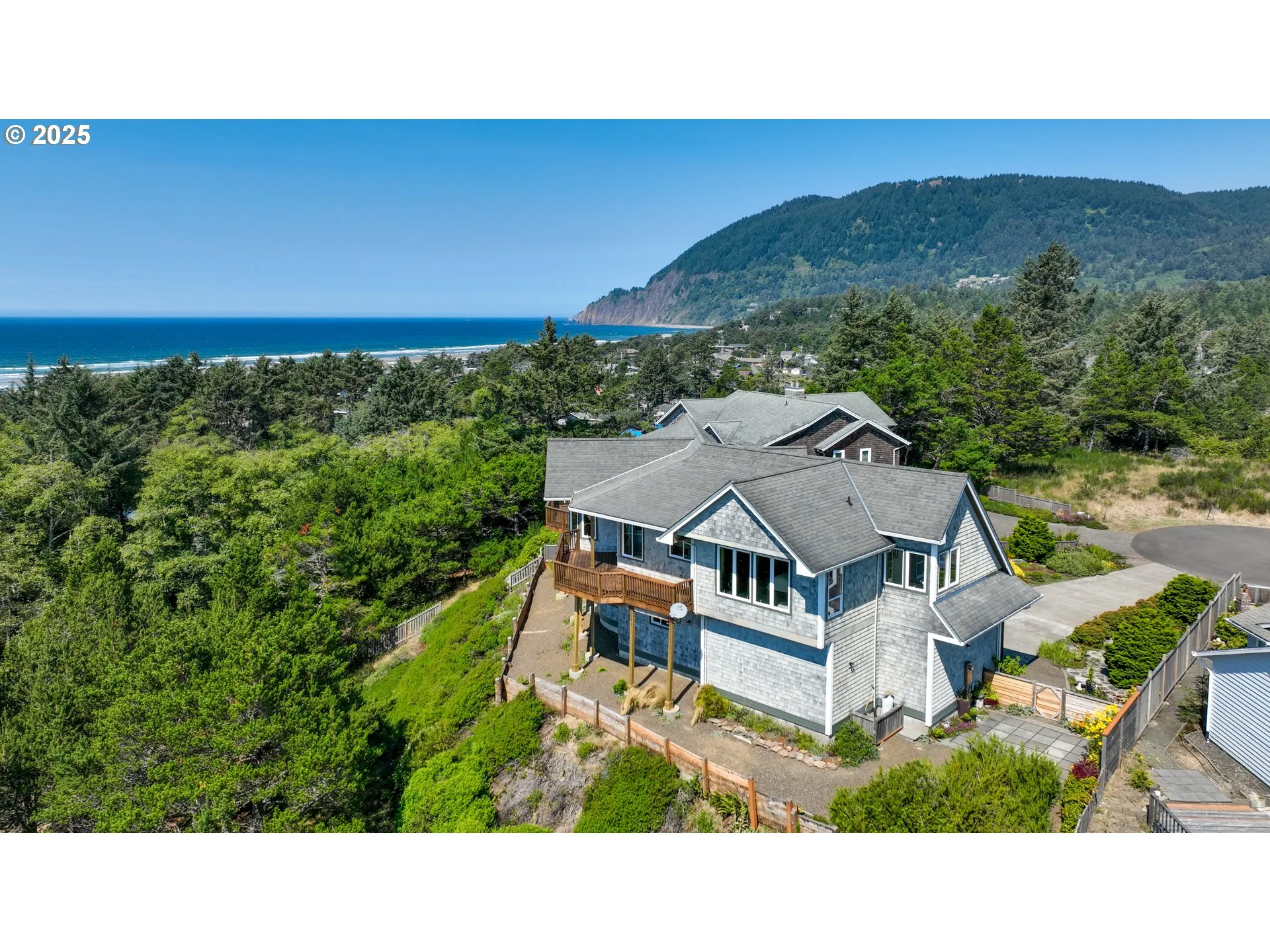Oh….the views! Spectacular and Panoramic! Sited on a spacious, and oversized lot, this lovely home was custom built to capture the ocean, cove, mountain, & golf course views. One of a kind with views from virtually every room.Lot offers opportunity to partition. This stunning home boasts 3 bedrooms (including a generous Primary ensuite), 3 bathrooms, 2 living areas- one on each level. Spacious upper decks for ultimate outdoor living & amazing evening sunsets plus nighttime dark sky viewing of the stars. Features include a state of the art elevator which accomodates up to 950 lbs. Large, beautifully landscaped lot including a serene private patio in the garden.Easy walk to the City Park & the quaint Village of Manzanita. Attached garage.See virtual tour: https://vimeo.com/1115643175?share=copy#t=0