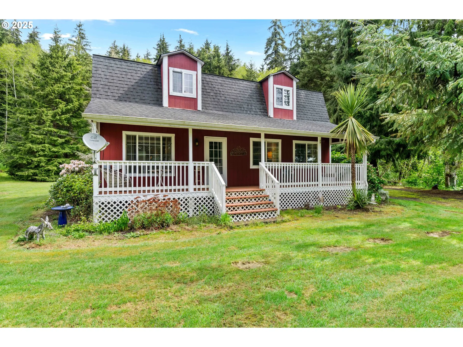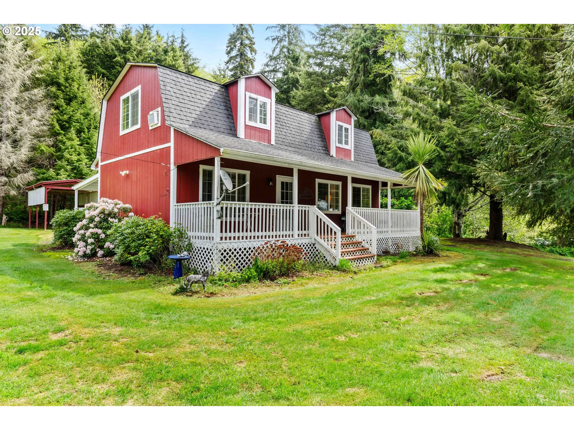 A unique Dutch Barn-style home full of warmth, character, and thoughtful touches, nestled on over 2.2 acres of lush Pacific Northwest landscape. With two bedrooms, two bathrooms, and 1,440 sq ft of well-designed living space, this home offers comfort, charm, and functionality. Step inside a beautiful galley kitchen featuring an antique Hoosier baker’s cabinet, a Jenn-Air range, a built-in dishwasher, a newer refrigerator, and a spacious pantry. The cozy living room invites you in with its propane gas fireplace and durable laminate wood floors, creating an ideal space to unwind. The main level also includes a welcoming bedroom and full bathroom with tile floors, a tile shower surround, and a granite countertop vanity. The dining area looks out to a lovely covered front porch, perfect for enjoying your morning coffee or evening sunsets. Upstairs, the oversized primary suite is a true retreat, complete with vaulted ceilings, a ceiling fan, a sitting area, and laundry space with washer and dryer. There’s also a dedicated office space and an ensuite bathroom featuring a jetted tub, tile flooring, and a walk-in tile shower. Outside, you’ll find a shipping container shop with a covered metal roof and two covered parking areas—ideal for your tools, toys, or projects. A separate covered RV parking structure with full RV hookups adds even more convenience and versatility to this fantastic property. Whether you’re looking for a peaceful full-time residence or a stylish weekend getaway, this property offers comfort and character with modern amenities—all just minutes from the Columbia River and the small-town charm of Cathlamet,WA.